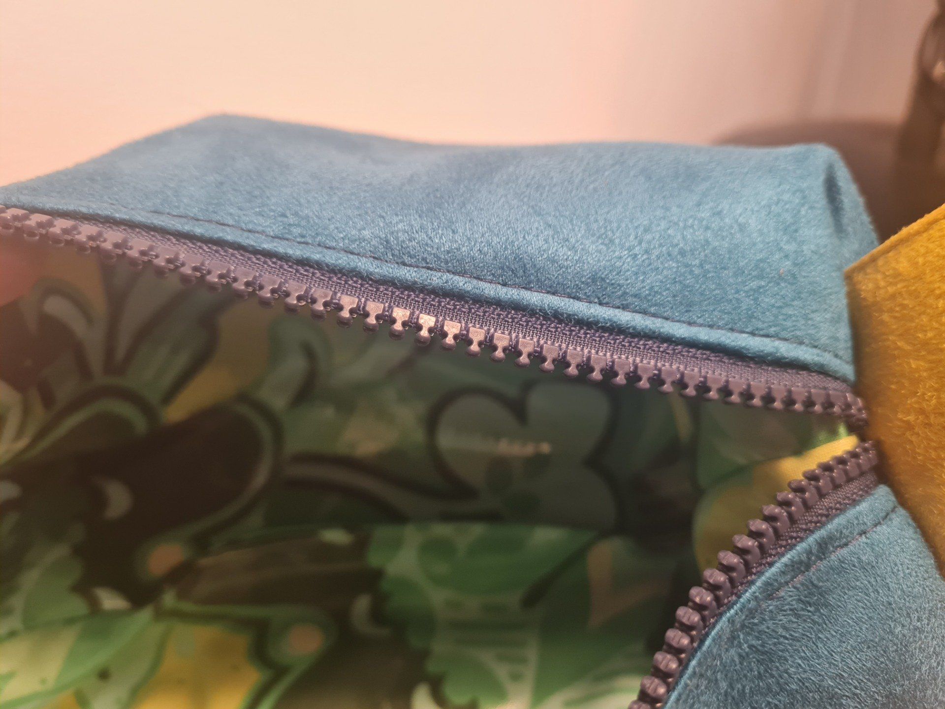 Trousse de toilette en velour lisse bleu, tissu décoratif en velour lisse jaune.