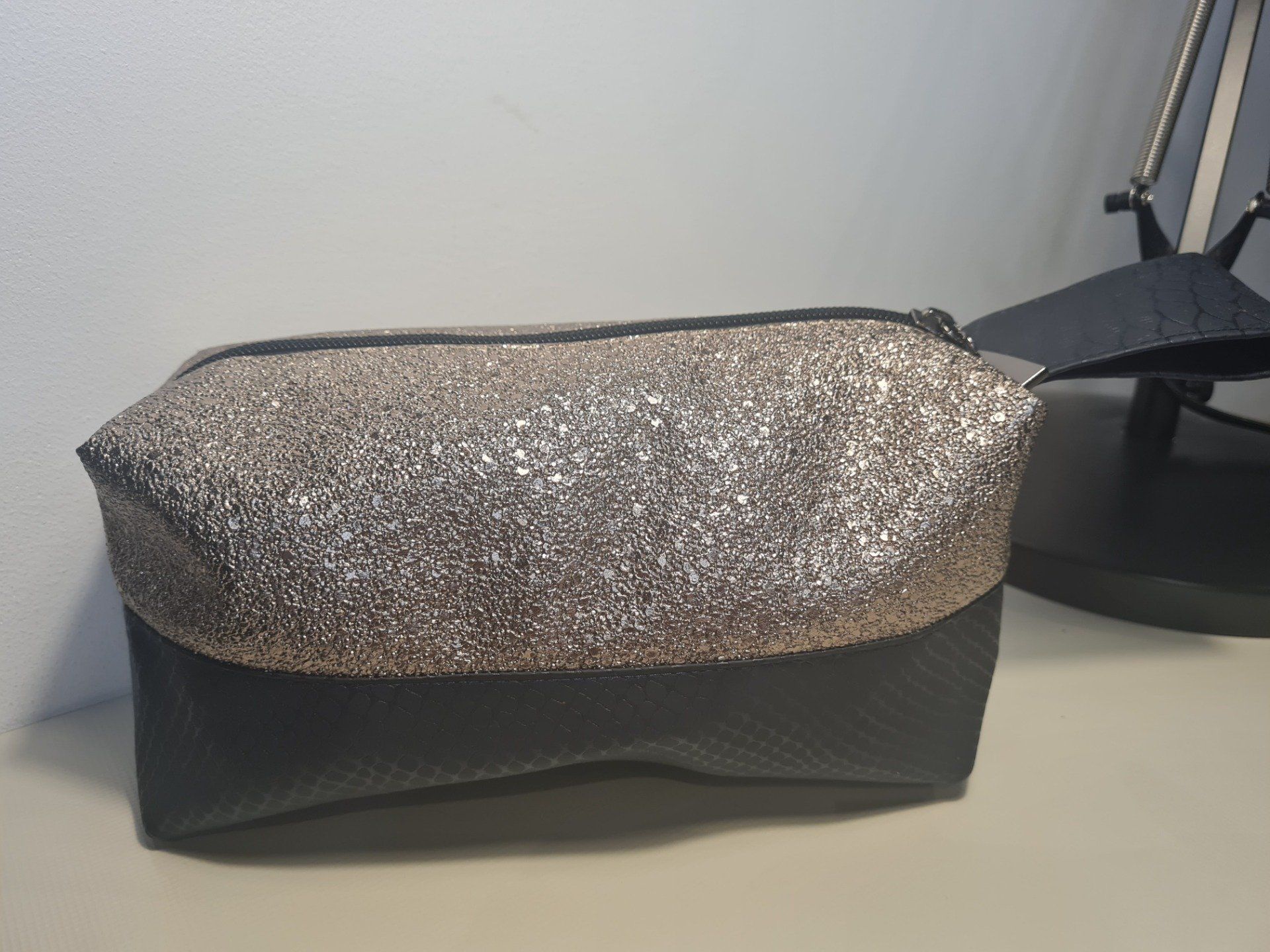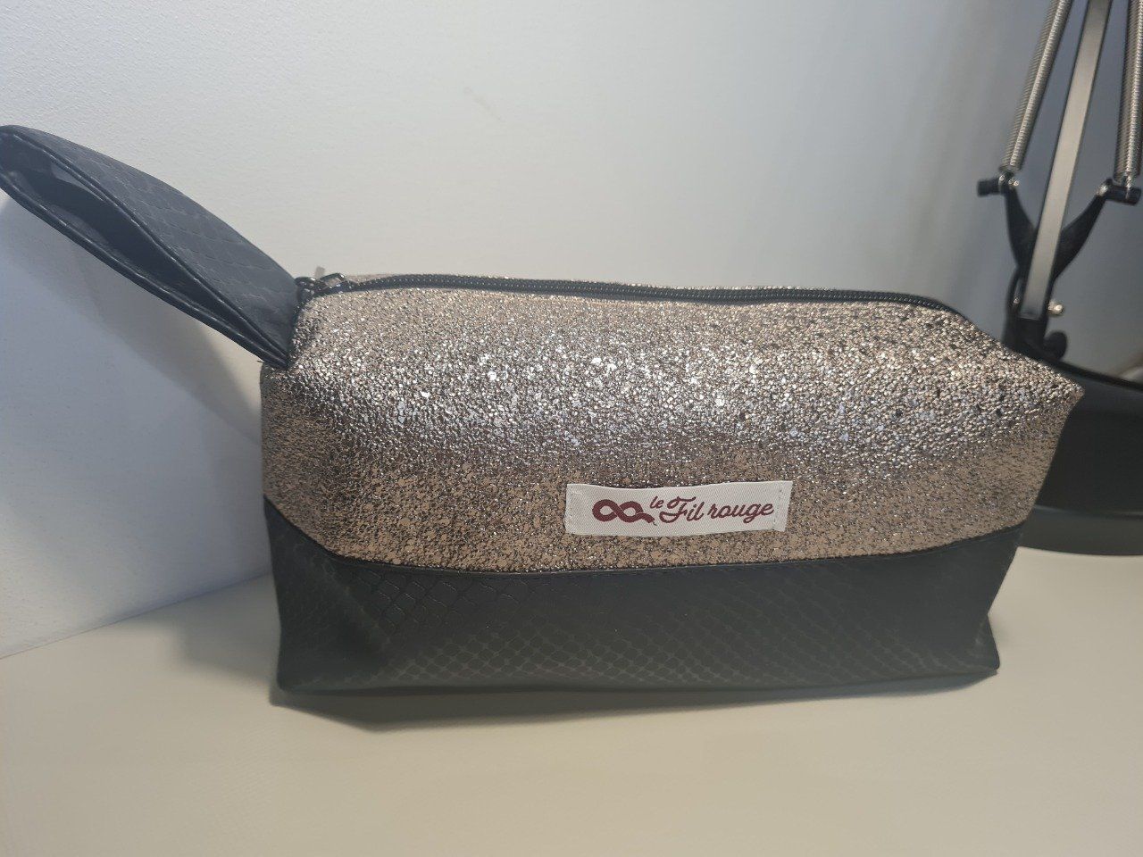 Trousse de toilette en simili cuir doré, tissu décoratif en simili cuir noir crocodile.