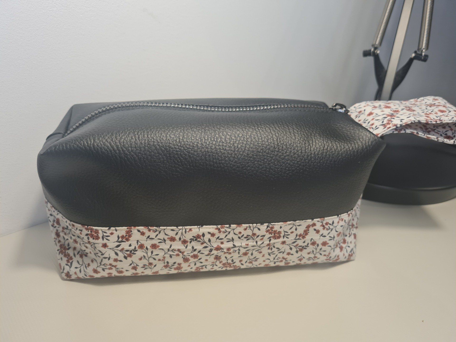 Trousse de toilette en simili cuir noir , tissu décoratif en coton.