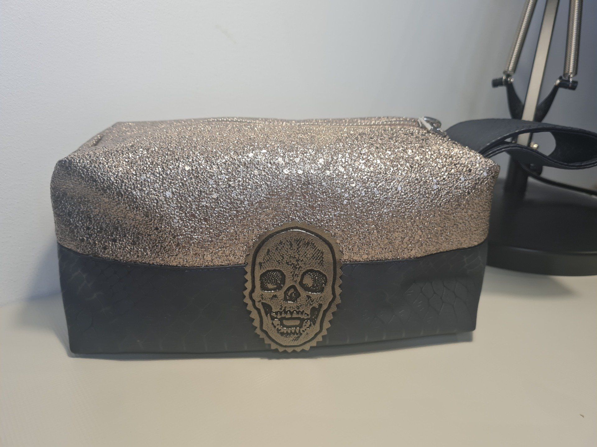 Trousse de toilette en simili cuir doré, tissu décoratif en simili cuir noir crocodile, un appliqué tête de mort de chaque côté.